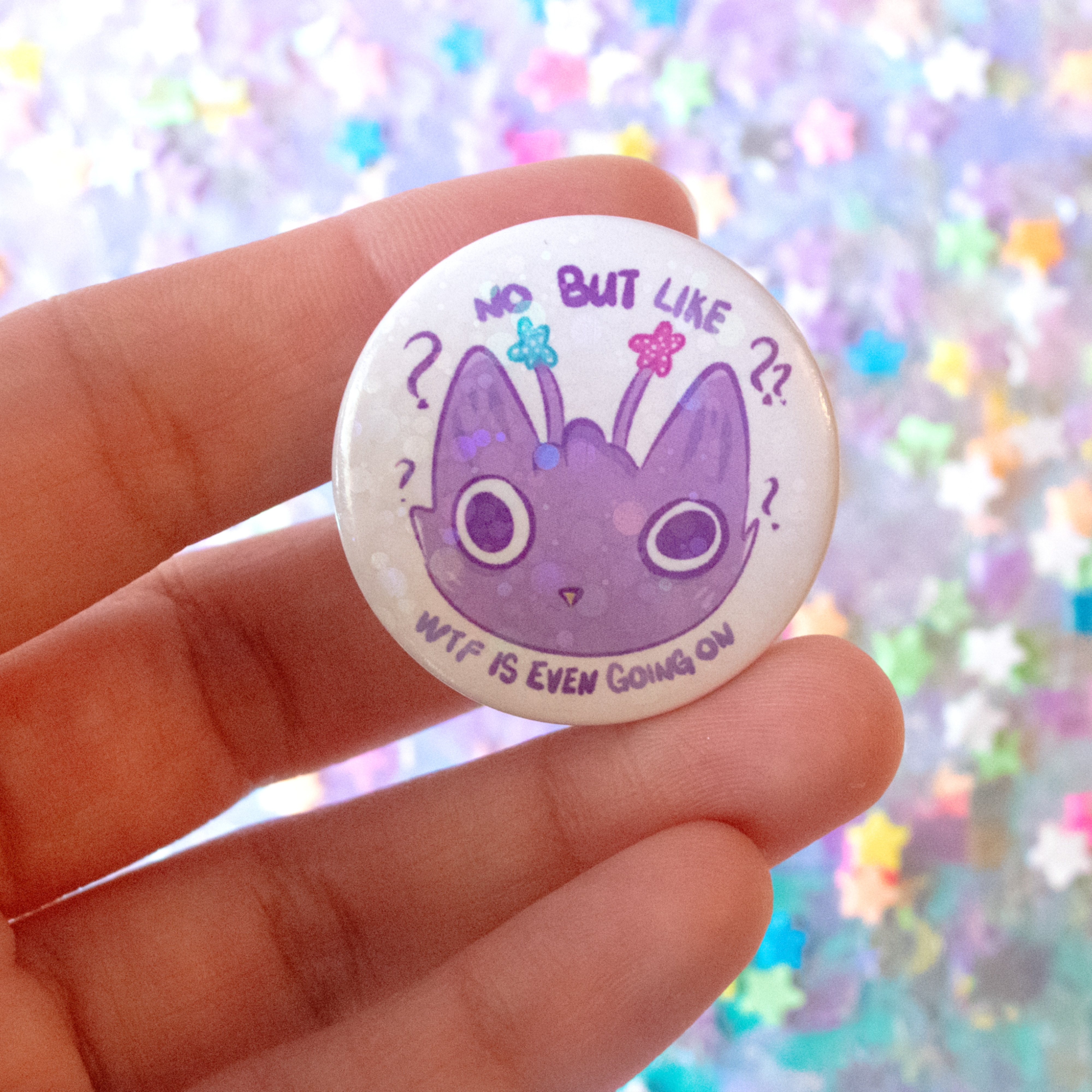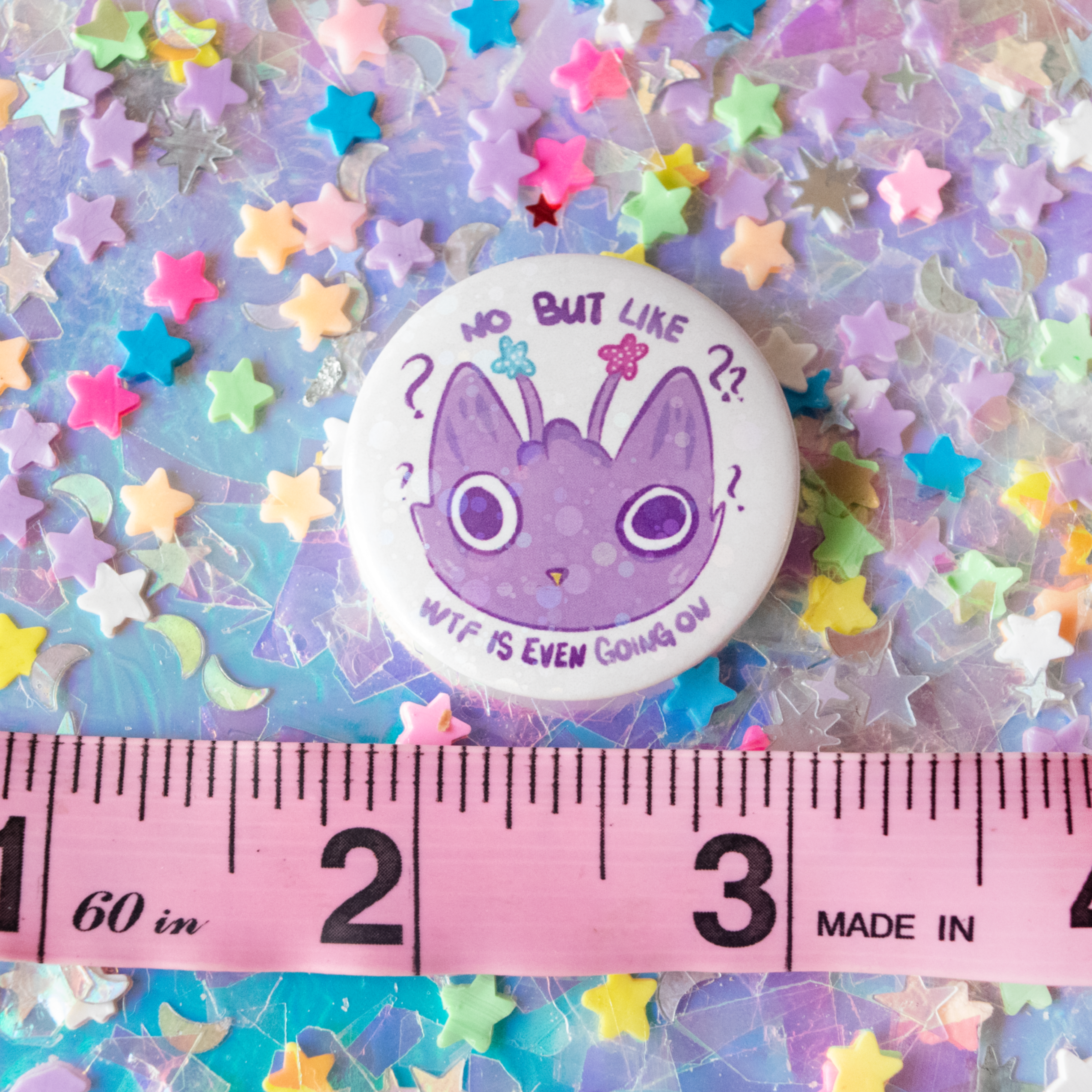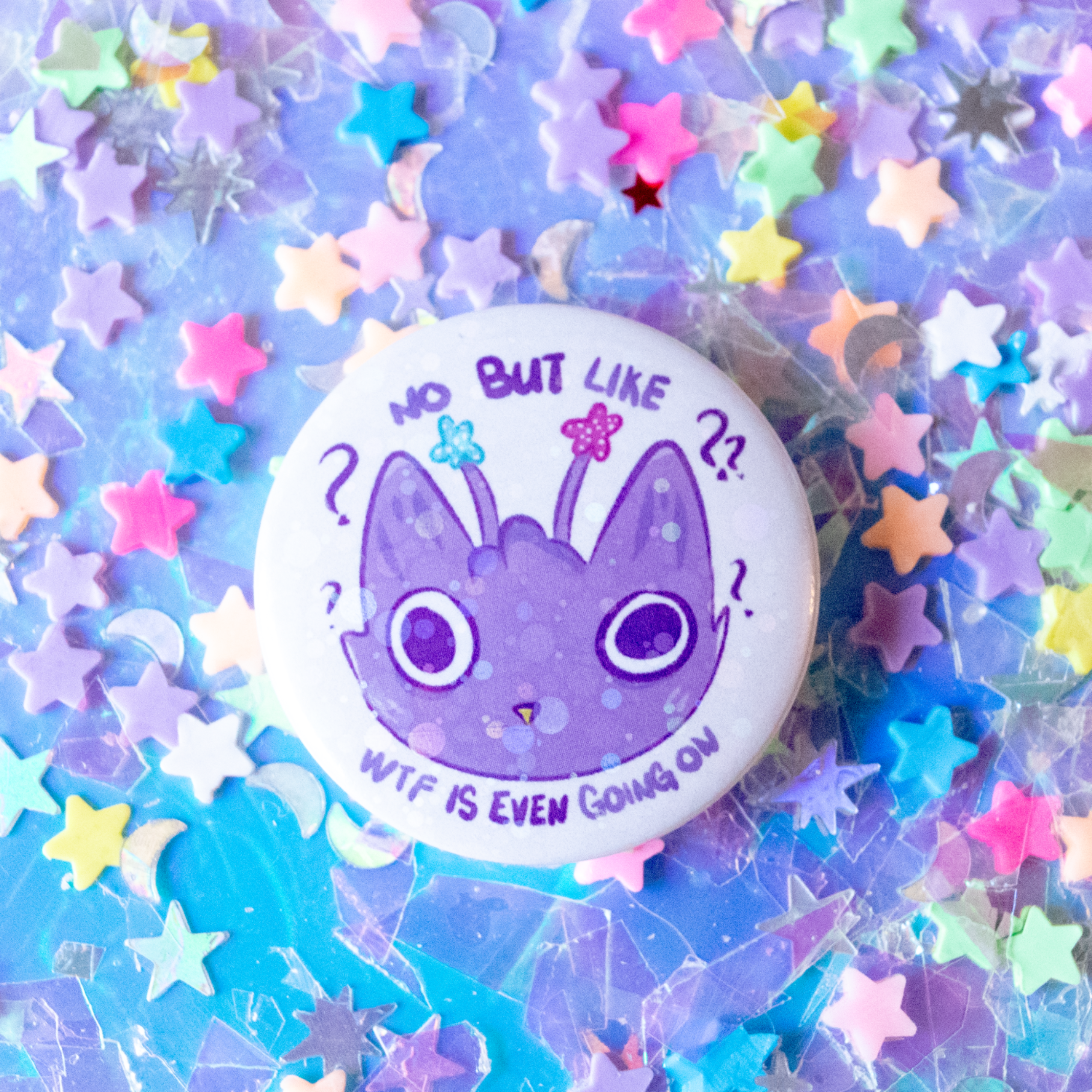 The iconic alien cat Stella, completely overwhelmed - now on a button.